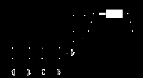 Рисунок 5.1 – Схема рычажной передачи 8ми-осного грузового вагона: 1 - Горизонтальный рычаг; 2 - Затяжка горизонтальных рычагов; 3 – Тяги; 4 - Горизонтальный балансир; 5 - Вертикальный рычаг; 6 - Затяжка вертикальных рычагов; 7 – Траверса; 8 – Подвески башмака