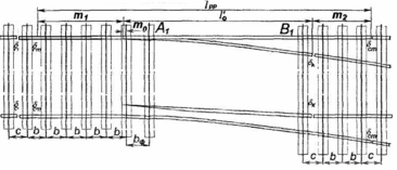 - число проміжних прогонів під переднім вильотом рамних рейок, звичайно приймається від 5 до 9. Конкретну кількість прогонів приймають в залежності від максимальної швидкості руху на бокову колію (при швидкостях 40...60 км/г - 5...6, понад 60 - 7...9).