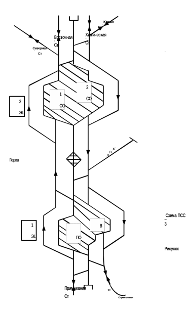 Восточная, ПСС – Химическая, ПСС – Южная, ПСС – Строительная. Средства поездной связи на перегонах – автоблокировка. На станции все стрелочные переводы включены в электрическую централизацию. Перегон ПСС обслуживает электровоз серии ВЛ10, на остальных перегонах в качестве вывозных локомотивов используют локомотивы ТЭМ 1, тепловозы этой же серии используется на маневровой работе. На станции ПСС парк «ПО» расположен последовательно относительно парка «СО» (схема расположения смотреть рисунок 3).