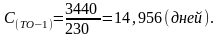 Полученное значение округляется до ближайшего целого числа - 14. Это означает, что через 14 дней эксплуатации на линии легковой автомобиль будет подвергаться первому техническому обслуживанию (ТО-1). За это время автомобиль пройдет: