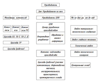 1. Четкое распределение административных и оперативных функций между руководящим персоналом и сосредоточение функций оперативного управления в едином центре или отделе управления производством (ЦУП или ОУП). Основными задачами ПУП являются сбор и автоматизированная обработка информации о состоянии производственных ресурсов и объемах работ, подлежащих выполнению, а также планирование и контроль деятельности производственных подразделений на основе анализа информации.