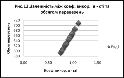 Отже взаємозв’язок між факторною ознакою – коефіцієнт використання вантажопідйомності та результативною ознакою – обсяг перевезень носить лінійний характер.