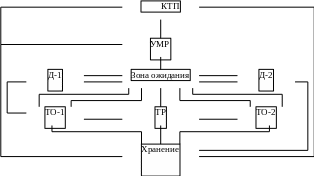 После Д-1 автомобиль поступает в зону ТО-1, затем в зону хранения. Туда же направляются автомобили после Д-2. Если при Д-1 не удается обнаружить неисправность, то автомобиль направляется на Д-2 через зону ожидания. После устранения обнаруженной неисправности автомобиль поступает в зону ТО-1, а затем оттуда в зону хранения.