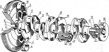 1 - коренная шейка; 2 - щека; 3 - упорные полукольца; 4 - нижний вкладыш пятого коренного подшипника; 5 - маховик; 6 - маслоотражатель; 7 -установочный штифт; 8 - болт крепления маховика; 9 - зубчатый венец; 10 - верхний вкладыш пятого коренного подшипника; 11 - шатунная шейка; 12 - щека; 13 - галтель; 14 - противовес; 15 - болт крепления противовеса; 16 - замковая шайба; 17 - шестерня коленчатого вала; 18 - ведущая шестерня привода масляного насоса; 19 - упорная шайба; 20 - болт; 21 - шкив; 22 - канал подвода масла в полость шатунной шейки; 23 - пробка; 24 - полость в шатунной шейке; 25 - трубка для чистого масла.