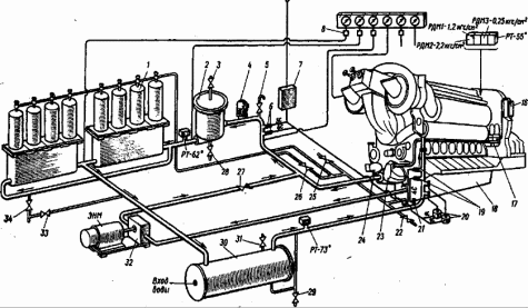 При работе дизеля горячее масло, прошедшее через узлы дизеля, стекает в поддон, вваренный в поддизельную раму 18. Шестеренчатый масляный насос 23, соединенный через редуктор с коленчатым валом дизеля, засасывает горячее масло из поддона и нагнетает его в фильтр грубой очистки 2 и полнопоточный фильтр тонкой очистки 1 в водомасляный теплообменник 30, откуда очищенное и охлажденное масло поступает на вход дизеля для охлаждения и смазки его узлов. Небольшая часть масла насосом 23 подается в центробежный фильтр тонкой очистки 17, из которого оно стекает в поддон. В теплообменнике масло охлаждается водой. Вода проходит внутри медных трубок вдоль теплообменника, а масло - в поперечном направлении, причем благодаря внутренним перегородкам оно несколько раз меняет направление движения.