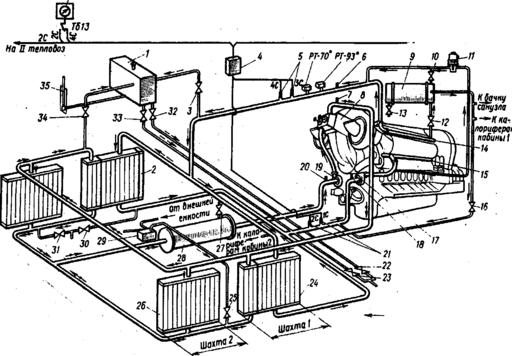 Рис 6. Схема водяной системы охлаждения дизеля. 1 - водяной бак; 2 - секция для охлаждения масла гидропривода вентиляторов; 3, 12, 16, 25, 32, 33, 34 - вентили; 4 - распределительная коробка №2; 5, 21 - датчики дистанционных электротермометров ЭТ1; 6, 7, 18,20 - гильзы для установки ртутных термометров; 8 - охладитель надувочного воздуха; 9 - топливоподогреватель; 10, 27 - игольчатые клапаны для удаления воздуха; 11 - терморегулятор; 13, 22, 23, 30, 31 - вентили для слива воды из системы; 14, /5 - коллекторы дизеля для отвода и подвода воды; 17 - насос I контура; 19 - насос II контура; 24 - радиаторные секции I контура (17 секций); 26 - радиаторные секции II контура (30 секций); 28 - водомасляный теплообменник; 29 - ручной насос; 35 - водомерное стекло; РТ-700, РТ-930 - термореле; Т613 - переключатель (тумблер); ЭТ1, ЭТЗ - указатели дистанционных электротермометров "Вода дизеля" и "Вода II тепловоза"; 1С-4С - электрические линии связи.
