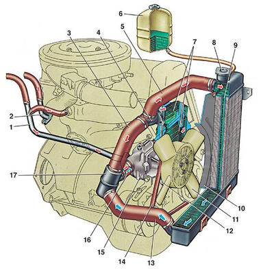 Система охлаждения — жидкостная, закрытого типа, с принудительной циркуляцией жидкости, с расширительным бачком. Насос охлаждающей жидкости центробежного типа, приводится в действие от шкива коленчатого вала клиновидным ремнем 14 (рис.).