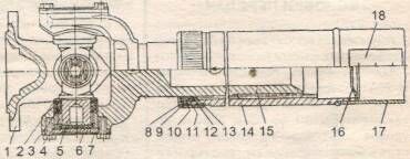 1 - фланец вилки; 2 - торцовое уплотнение; 3 - радиальное уплотнение; 4 - игольчатый подшипник; 5 - шип крестовины; 6 - замочная пластина; 7 - опорная пластина; 8 - гайка; 9, 11 - разрезные тарельчатые шайбы; 10 - войлочное уплотнительное кольцо; 12 - резиновое уплотнительное кольцо; 13 - разрезная шайба; 14 - шлицевая втулка; 15-скользящаявилка; 16-заглушка; 17 - карданный вал; 18 - балансировочная пластина.