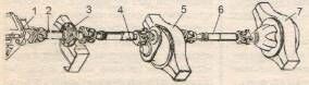 1 - коробка передач; 2 - основной карданный вал; 3 - промежуточная опора; 4 - карданный вал привода промежуточного моста; 5 - промежуточный мост; 6 - карданный вал привода заднего моста; 7 - задний мост.