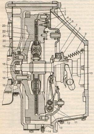 1 – картер маховика; 2 – фрикционные накладки ведомого диска; 3 – нажимной диск; 4 – кожух нажимного диска; 5 – нажимная пружина; 6 – картер сцепления; 7, 17 – шариковые подшипники; 8 – муфта подшипника выключения сцепления; 9 – оттяжная пружина муфты; 10 – вилка выключения сцепления; 11 – игольчатые ролики; 12 – крышка люка картера сцепления; 13 – нажимной рычаг; 14 – пробка со шплинтом; 15 – уплотнительная манжета; 16 – коленчатый вал двигателя; 18 – первичный вал коробки передач; 19 – большая и малая пружины демпфера; 20 – ведомый диск; 21 – пружинная пластина фрикционной накладки; 22 – заклепка; 23 – маховик.