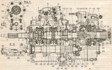 1 - первичный вал; 2 - крышка подшипника первичного вала; 3 - манжета; 4, 26, 27 - шариковые подшипники; 5, 12, 41, 45 - роликовые подшипники; 6 - стержень переключения передач; 7 - фиксатор; 8 - рычаг включения передач; 9 - блок клапанов включения демультипликатора; 10 - включатель фонарей заднего хода; 11 - крышка коробки передач; 13 - сателлит; 14 - ось сателлита; 15 - солнечная шестерня; 16 - пневматический цилиндр; 17 - шток поршня; 18 - вилка включения демультипликатора; 19 - датчик; 20 - шлицевая втулка; 21 - картер демультипликатора; 22 - шестерня привода спидометра; 23 - крышка подшипника вала демультипликатора; 24 - фланец; 25 - вал демультипликатора (выходной); 28 - синхронизатор в сборе; 29 - ступица коронной шестерни; 30 - пробка сливного отверстия; 31 - коронная шестерня; 32 - трубка нагнетающей магистрали масляного насоса; 33 - крышка подшипника; 34 - корпус масляного насоса; 35, 36 - ведомая и ведущая шестерни масляного насоса; 37, 51 - роликовые конические подшипники; 38 - шестерня первой передачи; 39 - крышка маслоприемника; 40 - муфта включения первой передачи и заднего хода; 42 - промежуточная шестерня заднего хода; 43 - шестерня второй и шестой передач; 44 - промежуточный вал; 46 - шестерня третьей и седьмой передач; 47 - шестерня четвертой и восьмой передач; 48 - вторичный вал; 49 - картер коробки передач; 50 - шестерня привода промежуточного вала; 52 - синхронизатор в сборе; 53 - трубка всасывающей магистрали; 54 - сетчатый фильтр; 55 - пробка отверстия для контроля уровня масла.