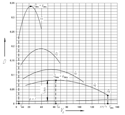 Для расчета динамического фактора D и построения динамической характеристики используют значения Fкi и Fв в функции скорости движения автомобиля V на различных передачах.