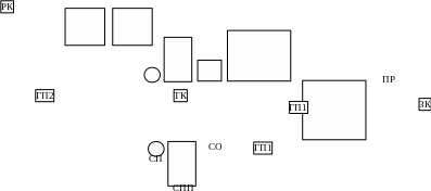 Загрузочный конвейер (ЗК) - > Моечная машина (ММ) - > Технологический конвейер (ТК) - > Кантователи (К) - > Гидравлический пресс (ГП1) - > Монорельс (М) - > Стенд для обрезки крышек (СО) - > Стол для постановки и приварки деталей (СПП) - > Гидравлический пресс (ГП2) - > Сварочный пост (СП) - > Электрогорн (ЭГ) - > Клепальная установка (КУ) - > Разгрузочный конвейер (РК) - > Комплектовочная тележка (КТ).