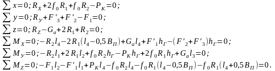 Считая, что автогрейдер находится в равновесии под действием системы сил и реакций, показанной на рисунке 2.4.3.1, а, можно найти силы и реакции из шести уравнений равновесия относительно пространственной системы координат xyz. Начало координат в точке О
