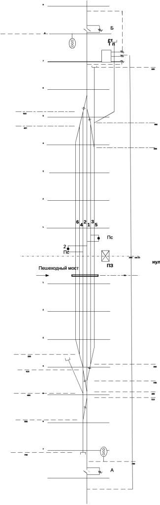 Цифрами на схеме указываются расстояния от оси пассажирского здания (в метрах) до остряков стрелок, входных светофоров, тупиков и пешеходных мостов, а также указываются расстояния между соседних путей.