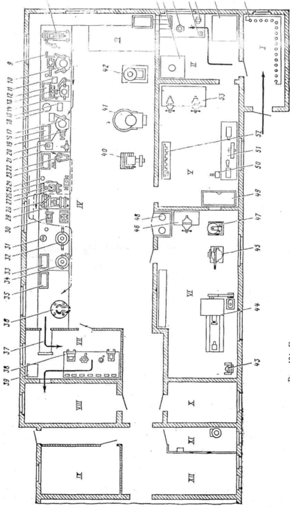 / — отделение для наружной очистки; // — отделение для разборки и очистки; /// — место для осмотра и определения объема ремонта; IV — отделение для ремонта приборов; V — отделение для ремонта арматуры; VI — механическое отделение; VII — отделение для контроля и испытания приборов; VIII — кладовая; IX — гальваническое отделение; X — контора мастера; XI — котельная; XII — бытовая комната
