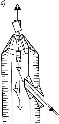 Для торцовой и боковой проходок организация работ драглайна и обратной лопаты аналогична. При этом сохраняется такое же соотношение максимальной глубины резания. Драглайн обычно передвигается между очередными стоянками на 1/5 длины стрелы. Так как ковш драглайна гибко подвешен к стреле, для него весьма эффективной является челночная схема работы (рис.8). В этой схеме предусмотрено, что автосамосвал подходит к месту загрузки по дну забоя и загружается попеременными черпаниями ковша по обе стороны от кузова. Угол поворота экскаватора при погрузке по продольно-челночной схеме приближается к 0°, а при поперечно-челночной - к 15...20°, при этом продолжительность разгрузки уменьшается, так как ковш опорожняется без прекращения поворотного движения экскаватора в момент переноса ковша над кузовом машины. Благодаря этому общая продолжительность рабочего цикла экскаватора