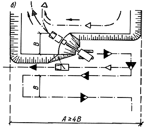 а - при погрузке грунта в транспорт, подаваемый по дну забоя;