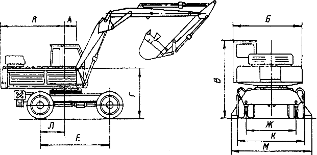 Л - от оси вращения экскаватора до оси задних колес, м+..++1