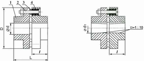 1 - полумуфта; 2 - палец; 3 - втулка распорная; 4 - втулка упругая.