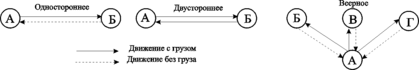 Схемы маршрутов могут быть различными. Маятниковые маршруты устанавливаются между двумя пунктами. Они могут быть односторонними, когда транспортные средства двигаются в одну сторону с грузом, а в другую – без груза, и двухсторонними, когда грузы транспортируются в обоих направлениях, и веерными (одно- или двухсторонними), рис. 1