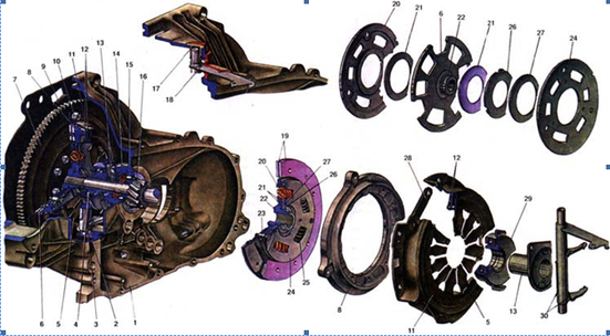 1. Картер сцепления; 2. Опорная втулка вала вилки выключения сцепления; 3. Вилка выключения сцепления; 4. Подшипник выключения сцепления; 5. Нажимная пружина; 6. Ведомый диск; 7. Маховик; 8. Нажимной диск; 9. Шкала для проверки момента зажигания; 10. Болт крепления сцепления к маховику; 11. Кожух сцепления; 12. Опорные кольца нажимной пружины; 13. Направляющая втулка муфты подшипника выключения сцепления; 14. Сальник первичного вала коробки передач; 15. Подшипник первичного вала; 16. Первичный вал; 17. Втулка вала вилки выключения сцепления; 18. Защитный чехол вилки выключения сцепления; 19. Фрикционные накладки ведомого диска; 20. Передняя пластина демпфера; 21. Фрикционные кольца демпфера; 22. Ступица ведомого диска; 23. Упор демпфера; 24. Задняя пластина демпфера; 25. Пружина демпфера; 26. Опорное кольцо пружинной шайбы; 27. Пружинная шайба демпфера; 28. Пластина, соединяющая кожух сцепления с нажимным диском; 29. Муфта подшипника выключения сцепления; 30. Соединительная пружина вилки и муфты подшипника выключения сцепления.