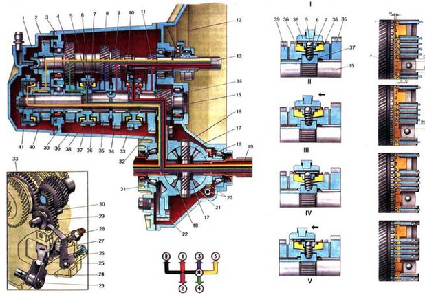 1. Задняя крышка; 2. Ведущая шестерня V передачи; 3. Картер коробки передач; 4. Ведущая шестерня IV передачи; 5. Шарик фиксатора; 6. Пружина фиксатора; 7. Сухарь фиксатора; 8. Ведущая шестерня III передачи; 9. Ведущая шестерня II передачи; 10. Ведущая шестерня заднего хода; 11. Ведущая шестерня I передачи; 12. Картер сцепления; 13. Первичный вал коробки передач; 14. Ведущая шестерня главной передачи; 15. Вторичный вал; 16. Ось сателлитов; 17. Сателлит; 18. Полуосевая шестерня; 19. Сальник полуоси; 20. Шестерня привода спидометра; 21. Коробка дифференциала; 22. Ведомая шестерня главной передачи; 23. Шток выбора передач; 24. Рычаг штока выбора передач; 25. Трехплечий рычаг выбора передач; 26. Фиксатор вилки заднего хода; 27. Вилка заднего хода; 28. Выключатель фонаря заднего хода; 29. Промежуточная шестерня заднего хода; 30. Ось промежуточной шестерни заднего хода; 31. Регулировочное кольцо; 32. Ведомая шестерня I передачи; 33. Скользящая муфта включения 1, II передач и заднего хода; 34. Ведомая шестерня II передачи; 35. Ведомая шестерня III передачи: 36. Блокирующее кольцо синхронизатора III и IV передач; 37. Ступица муфты синхронизатора III и IV передач; 38. Скользящая муфта синхронизатора III и IV передач; 39. Ведомая шестерня IV передачи; 40. Ведомая шестерня V передачи; 41. Скользящая муфта синхронизатора V передачи; 42. А выступ блокирующего кольца; а, в, с зазоры; 43. I.Схема работы синхронизатора; 44. II.Нейтральное положение; 45. III.Начало включения; 46. IV.передачи; 47. IV.Завершение выравнивания угловых скоростей шестерни 39 и вала 15; 48. V.Полное включение IV передачи.
