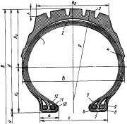 1— каркас; 2 — брекер; 3 — протектор; 4 — боковина; 5 — борт; 6 — носок борта; 7 — основание борта; 8 — пятка борта; 9 — бортовая лента; 10 — бортовая проволока; 11 — обертка; 12 — наполнительный шнур; H — высота профиля покрышки; H1 — расстояние от основания до горизонтальной осевой линии профиля; H2 — расстояние от горизонтальной оси до экватора; В — ширина профиля; B6 — корона; R — радиус кривизны протектора; D — наружный диаметр шины; d — посадочный диаметр шины; h — стрела дуги протектора; С — ширина раствора бортов; а — ширина борта.