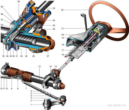 1 – поворотный рычаг; 2 – шаровой шарнир наконечника; 3 – наружный наконечник рулевой тяги; 4, 6 – контргайка; 5 – регулировочная тяга (муфта); 7, 12 – внутренний наконечник рулевой тяги; 8 – болты крепления внутреннего наконечника рулевой тяги к рейке; 9 – защитный чехол; 10, 28 – опоры рулевого механизма; 11 – скоба крепления рулевого механизма; 13 – картер рулевого механизма; 14 – стяжной болт муфты; 15 – эластичная муфта; 16 – кронштейн крепления вала рулевого управления; 17 – нижняя часть облицовочного кожуха; 18 – вал рулевого управления; 19 – верхняя часть облицовочного кожуха; 20 – подшипник; 21 – демпфер; 22 – рулевое колесо; 23 – промежуточный вал рулевого управления; 24 – фланец эластичной муфты; 25 – пыльник; 26 – уплотнительное кольцо; 27 – защитный колпачок; 29 – рейка; 30 – уплотнительное кольцо упора; 31 – упор рейки; 32 – пружина; 33 – гайка упора; 34 – стопорное кольцо гайки упора; 35 – роликовый подшипник; 36 – приводная шестерня; 37 – шариковый подшипник; 38 – стопорное кольцо; 39 – защитная шайба; 40 – гайка подшипника.