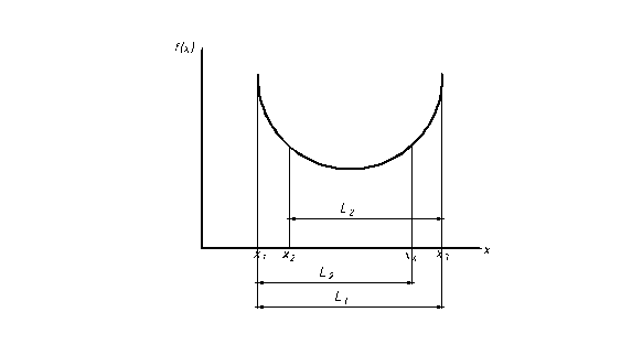 В результате анализа двух рассмотренных значений функции будет определен тот интервал, который должен исследоваться в дальнейшем. Этот интервал будет содержать одну из предыдущих точек и следующую точку, помещаемую симметрично ей. Первая точка находится на расстоянии L1/τ от одного конца интервала, вторая — на таком же расстоянии от другого. Поскольку