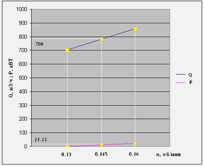 График зависимости производительности Q и мощности Р от частоты вращения n.