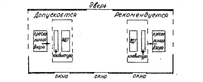 - монитор должен устанавливаться так, чтобы не было бликов и ДСП смотрел на него под углом 90, а не сбоку; не ближе 70см от экрана и 1,2м от стенок дисплея;