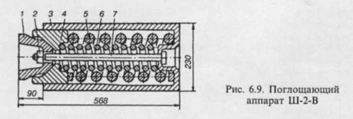 Аппарат Ш-2-В имеет литой корпус 3, три штампованных фрикционных клина 4,штампованный нажимной конус 1, наружная 5 и внутренняя 6 пружины, стяжной болт 7 с гайкой 2. Масса аппарата 134 кг