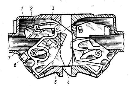 Внутри головной части размещены детали механизма сцепления. Она имеет большой 1 и малый 4 зубья, которые соединяясь образуют зев. На вертикальной стенке зева, возле малого зуба имеется окно для замка 3, а рядом - окно для замкодержателя 2.