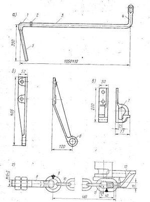 Рис. 6 Детали расцепного привода : а) расцепной рычаг, б) державка, в) кронштейн, г) цепь расцепного привода.