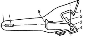 Расцепной рычаг рис. 6 (а), предназначенный для расцепления автосцепки, имеет короткое плечо 4 с отверстием для регулировочного болта, стержень 3 и рукоятку 5, соединенные плоской частью 1, поперечное сечение которой 20 × 35 мм.