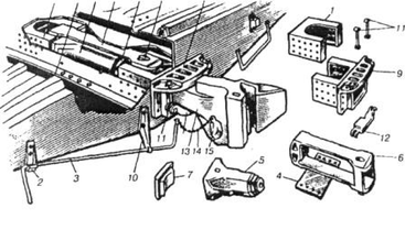Нижней опорой тягового хомута и поглощающего аппарата является поддерживающая планка 4, прикрепляемая восемью болтами снизу к хребтовой балке. Тяговый хомут 6 представляет собой раму, внутри которой размещен поглощающий аппарат и упорная плита.