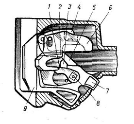 Продвигаясь в зевах дальше, малые зубья нажимают на лапы 4 замкодержателей, заставляя их поворачиваться. В этот момент противовесы 1 замкодержателей размещаются под верхними плечами 3 предохранителей, создавая для них опору.