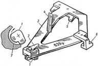 положение задней кромки К овального отверстия относительно торца замка на соответствие шаблону 839р; который накладывают на замок так, чтобы шаблон своим основанием 2 плотно прилегал к плоскости замка. Затем перемещением шаблона за рукоятку 3 в направлении стрелки А обеспечивают плотное прилегание опорных площадок 4 к торцевой поверхности замка, а угольника 5 – к его нижней опорной части. Удерживая шаблон в таком положении, поворачивают за рукоятку мерительный сектор 1 по часовой стрелке. Замок считают годным, если проходная часть мерительного сектора 1 свободно проходит мимо кромки отверстия замка, а непроходная часть не проходит (упирается в кромку отверстия).