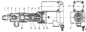 1 - корпус; 2 - втулка; 3 - клапан; 4 - стопорная проволока; 6 - шток; в - стакан; 7 - шпонка; 8 - направляющая; 9 - стопорный винт; 10 - упор; 11 - кронштейн; 12 - прокладка; 13 - шпилька; 14 -шайба; 15, 16 - уплотнительные кольца; I7 - электромеханизм.
