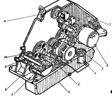 Раздаточная коробка (рис. 3) предназначена дня передачи крутящего момента от двигателя к трем насосам НП-5Щ, маслонасосу МШ-ЗА, генератору ГСР-СТ-12ОО0ВТ и осевому вентилятору. Раздаточная коробка представляет собой редуктор с цилиндрическими прямозубыми шестернями внешнего зацепления, установленными в разъемном корпусе, состоящем из верхней части и поддона.