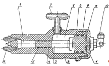 1-крышка; 2-корпус; 3-поршень; 4,5-уплотнительнне кольца малой ступени; 6-штуцер; 7-тройник; 8,9-уплотнительные кольца большой ступени; 10-угольник; а,б,в-полости.