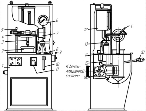 Стенд А106 для проверки работы форсунок ДВС: 1 – стол; 2 – сборник; 3 – проверяемая форсунка; 4 – зажимное устройство; 5, 9 – краны; 6 – манометр; 7 – пневмоцилиндр; 8 – топливный насос; 10 – ручка насоса; 11 – выключатель; 12 – топливный бак; 13 – фильтр; 14 – промывочный аккумулятор; 15 – отстойник; 16 – вентиляционный патрубок.