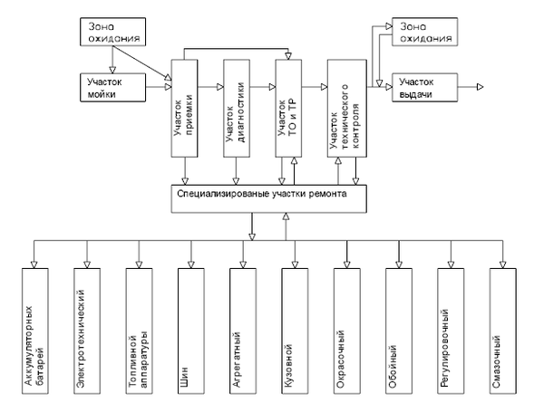 После приемки автомобиль направляется на соответствующий производственный участок. При этом работы текущего ремонта предшествуют работам технического обслуживания. В случае занятости рабочих постов, на которых должны выполняться работы согласно наряд - заказу, автомобиль поступает в зону ожидания, а оттуда по мере освобождения постов направляется на тот или иной производственный участок. После завершения работ автомобиль поступает на участок выдачи.