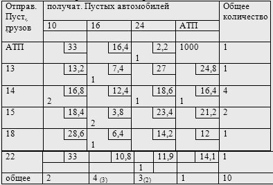 Расстояния между АТП и АТП ставятся заведомо большими, чтобы автомобиль, выйдя из АТП, не вернулся туда обратно сразу же. Если груз вывозится из пункта за один раз, то эта клетка также блокируется большим расстоянием. Затем, используя матрицы по порожним и груженым ездкам, составляем маршрут движения.