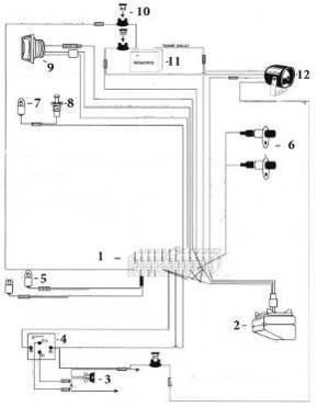 Рис. 3.1. Схематична будова сигналізації 1 – блок сигналізації; 2 – датчик з дистанційним регулюванням; 3 – замок запалювання; 4 – реле блокування стартера; 5, 7 – лампи зовнішніх світлових приладів; 6 – кінцевики багажника, капота; 8 – кінцевик дверей; 9 – кодований перемикач; 10 – запобіжники; 11 – акумуляторна батарея; 12 – автономна сирена.
