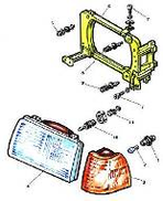 Рис. 2.2. Фара у розібраному стані 1- патрон лампи покажчика повороту; 2 - лампа покажчика повороту; 3 - покажчик повороту; 4 - фара; 5 - гвинт регулювання фари в вертикальній площині; 6 - стійка фари; 7 - гвинт; 8 - гвинт кріплення фари; 9 - гвинт регулювання фари в горизонтальній площині; 10 - патрон з лампою фари; 11 - сполучна колодка