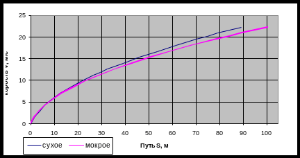 Аналогично проводим расчёт для значений V = 5,6; 8,3; 11,1; 13,9; 16,6; 19,4; 22,2 м/с для мокрого покрытия, и результаты расчётов сводим в таблицу 2.