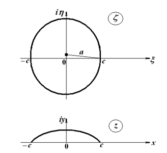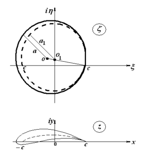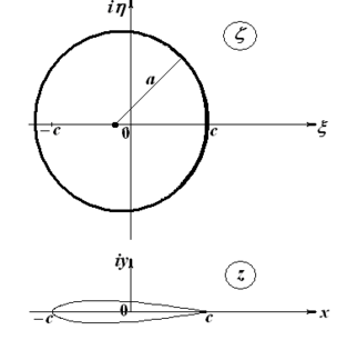 Жуковский первый рассмотрел применение конформного отображения в теории профиля. Он предложил простую функцию преобразования внешности круга во вспомогательной плоскости на внешность замкнутого профиля в плоскости течения: