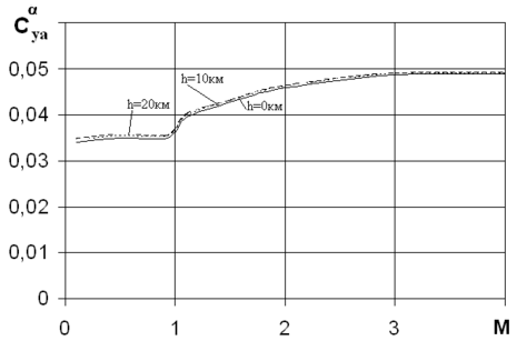 Рисунок 10 - Производная коэффициента аэродинамической подъемной силы по углу атаки для высот 0, 10, 20 км
